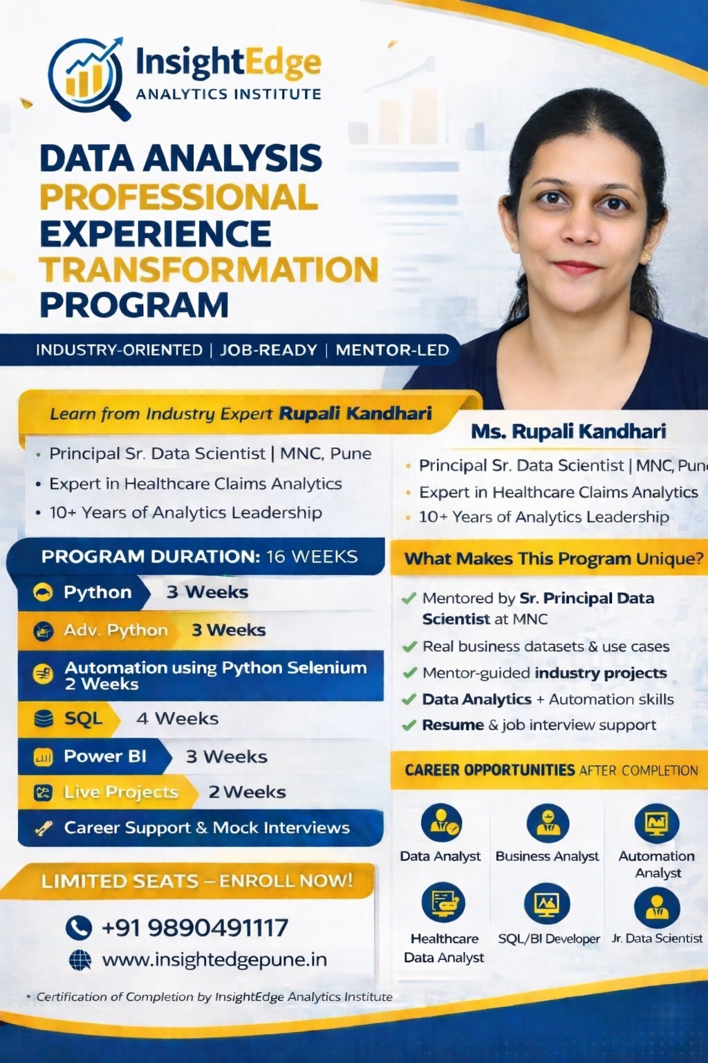 Mentored by Principal Sr. Data Scientist (MNC) Analytics + Automation skill combination Real business datasets & use cases Resume & interview-focused training Long-term career sustainability Devops + Data Analytics + Automation + Global Certification Guidance We are happy to announce the LIVE Batch of Data Analytics starting in the January 2026
